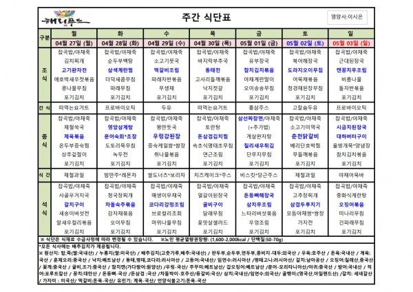 4월 넷째주 식단표 페이지 정보 작성자 은천노인복지회 작성일26-04-27 17:08 조회6회 댓글0건 관련링크 다음글 목록 답변 본문 4월 넷째주 어르신 식단표 안내해 드립니다. 정성과 영양을 담아 준비하겠습니다. 다음글 목록 답변