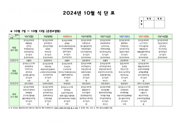 10월 둘째주 식단표 페이지 정보 작성자 은천노인복지회 작성일24-10-04 11:48 조회15,007회 댓글0건 관련링크 이전글 다음글 목록 답변 본문 . 이전글 다음글 목록 답변