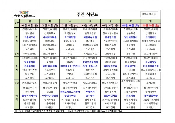 3월 넷째주 식단표 페이지 정보 작성자 은천노인복지회 작성일26-03-20 16:40 조회788회 댓글0건 관련링크 이전글 다음글 목록 답변 본문 3월 넷째주 어르신 식단표 안내해 드립니다. 정성과 영양을 담아 준비하겠습니다. 이전글 다음글 목록 답변