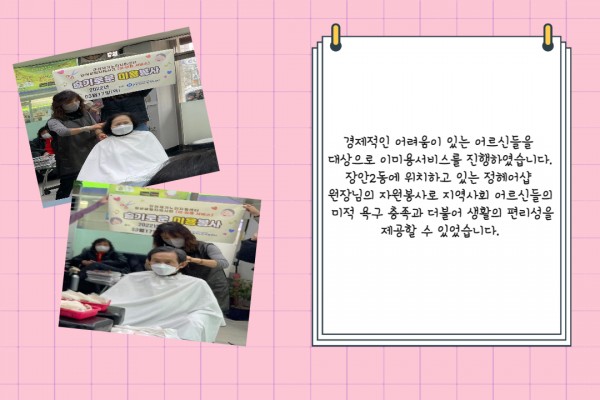 [재가노인지원서비스] 이미용 서비스 페이지 정보 작성자 은천노인복지회 작성일22-03-30 14:02 조회17,278회 댓글0건 관련링크 이전글 다음글 목록 답변 본문 3월 이미용 서비스 이전글 다음글 목록 답변