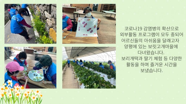 [재가노인지원] 봄 나들이 페이지 정보 작성자 은천노인복지회 작성일22-06-03 17:15 조회16,983회 댓글0건 관련링크 이전글 다음글 목록 답변 본문 재가노인지원센터 어르신들과 양평 보릿고개마을로 나들이를 다녀왔습니다. 이전글 다음글 목록 답변