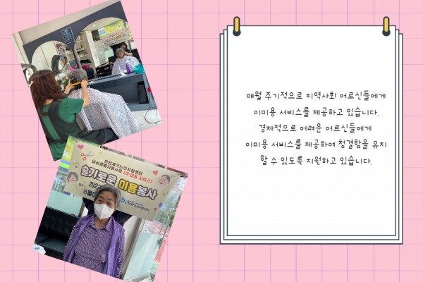 [재가노인지원서비스] 이미용 서비스 페이지 정보 작성자 은천노인복지회 작성일22-07-06 13:27 조회16,462회 댓글0건 관련링크 이전글 다음글 목록 답변 본문 6월 이미용 서비스 이전글 다음글 목록 답변