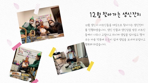 [재가노인지원서비스 ] 12월 찾아가는 생신잔치 페이지 정보 작성자 은천노인복지회 작성일21-12-31 13:32 조회18,678회 댓글0건 관련링크 이전글 다음글 목록 답변 본문 12월 찾아가는 생신잔치 이전글 다음글 목록 답변