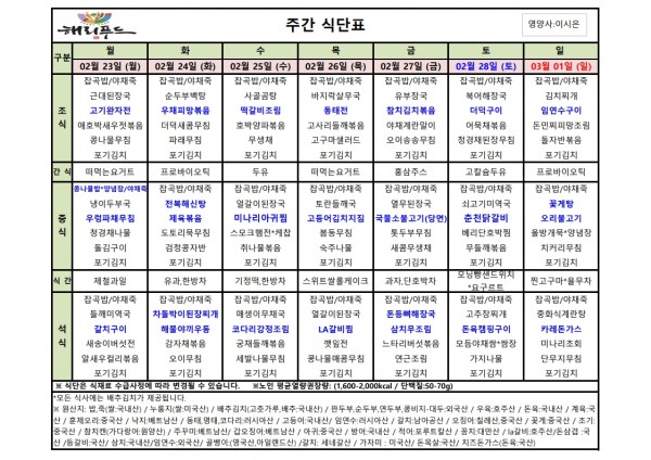 2월 넷째주 식단표 페이지 정보 작성자 은천노인복지회 작성일26-02-20 16:17 조회3,366회 댓글0건 관련링크 이전글 다음글 목록 답변 본문 2월 넷째주 어르신 식단표 안내해 드립니다. 정성과 영양을 담아 준비하겠습니다. 이전글 다음글 목록 답변
