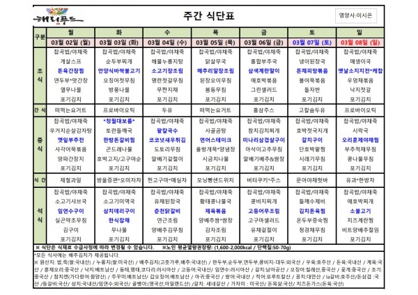 3월 첫째주 식단표 페이지 정보 작성자 은천노인복지회 작성일26-02-27 13:13 조회2,646회 댓글0건 관련링크 이전글 다음글 목록 답변 본문 2월 넷째주 어르신 식단표 안내해 드립니다. 정성과 영양을 담아 준비하겠습니다. 이전글 다음글 목록 답변