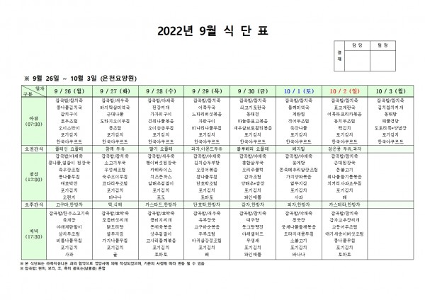 9월 다섯째주 식단표 페이지 정보 작성자 은천노인복지회 작성일22-09-22 17:36 조회96,408회 댓글0건 관련링크 이전글 다음글 목록 답변 본문 . 이전글 다음글 목록 답변