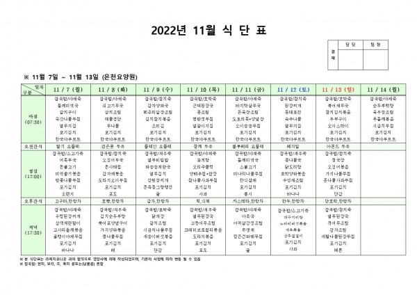 11월 둘째주 식단표 페이지 정보 작성자 은천노인복지회 작성일22-11-10 10:10 조회93,407회 댓글0건 관련링크 이전글 다음글 목록 답변 본문 . 이전글 다음글 목록 답변