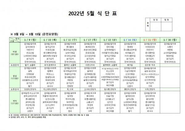5월 둘째주 식단표 페이지 정보 작성자 은천노인복지회 작성일22-05-06 10:04 조회107,591회 댓글0건 관련링크 이전글 다음글 목록 답변 본문 . 이전글 다음글 목록 답변