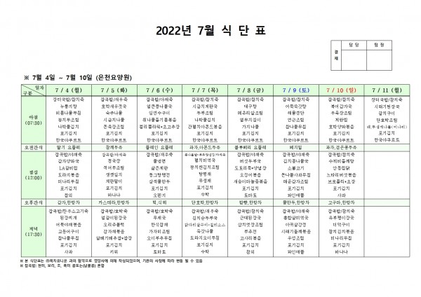 7월 첫째주 식단표 페이지 정보 작성자 은천노인복지회 작성일22-06-30 17:17 조회102,314회 댓글0건 관련링크 이전글 다음글 목록 답변 본문 . 이전글 다음글 목록 답변