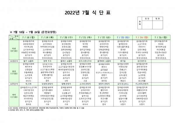 7월 셋째주 식단표 페이지 정보 작성자 은천노인복지회 작성일22-07-20 10:16 조회102,236회 댓글0건 관련링크 이전글 다음글 목록 답변 본문 . 이전글 다음글 목록 답변