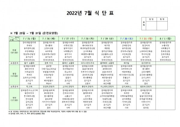 7월 넷째주 식단표 페이지 정보 작성자 은천노인복지회 작성일22-07-21 17:04 조회102,429회 댓글0건 관련링크 이전글 다음글 목록 답변 본문 . 이전글 다음글 목록 답변