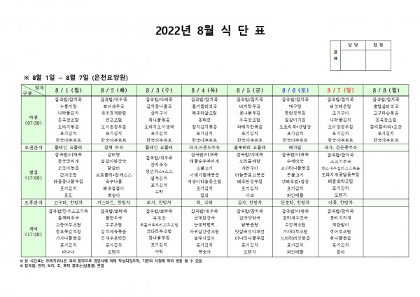8월 첫째주 식단표 페이지 정보 작성자 은천노인복지회 작성일22-08-01 13:36 조회101,684회 댓글0건 관련링크 이전글 다음글 목록 답변 본문 . 이전글 다음글 목록 답변