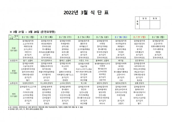 3월 넷째주 식단표 페이지 정보 작성자 은천노인복지회 작성일22-03-17 17:31 조회114,004회 댓글0건 관련링크 이전글 다음글 목록 답변 본문 . 이전글 다음글 목록 답변