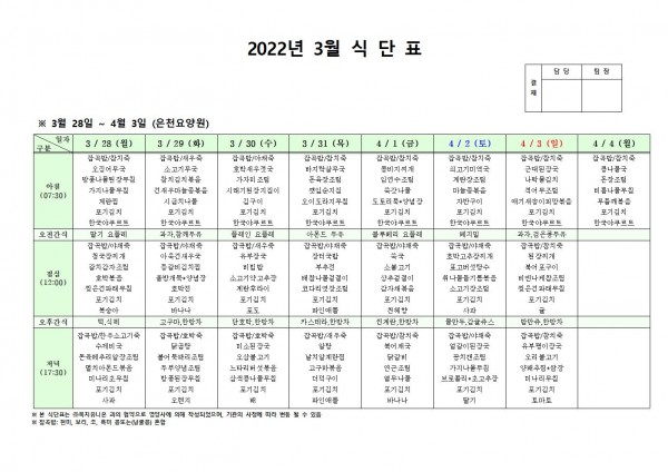 3월 다섯째주 식단표 페이지 정보 작성자 은천노인복지회 작성일22-03-25 10:40 조회113,524회 댓글0건 관련링크 이전글 다음글 목록 답변 본문 . 이전글 다음글 목록 답변