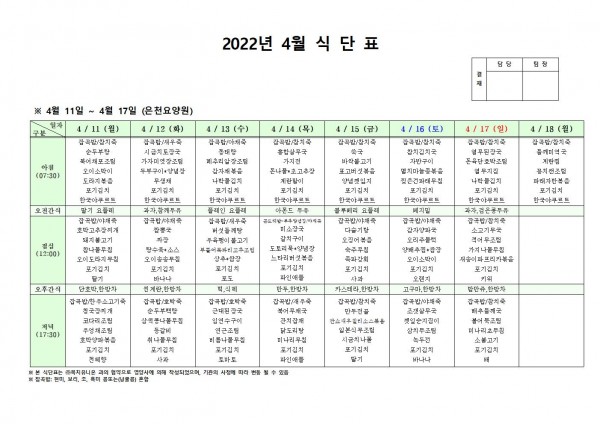 4월 둘째주 식단표 페이지 정보 작성자 은천노인복지회 작성일22-04-11 16:27 조회111,887회 댓글0건 관련링크 이전글 다음글 목록 답변 본문 . 이전글 다음글 목록 답변