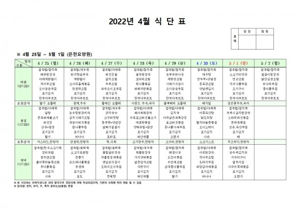 4월 넷째주 식단표 페이지 정보 작성자 은천노인복지회 작성일22-04-22 15:56 조회110,381회 댓글0건 관련링크 이전글 다음글 목록 답변 본문 . 이전글 다음글 목록 답변