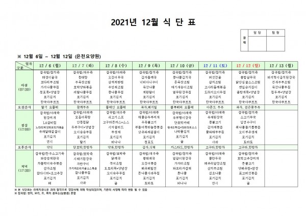 12월 둘째주 식단표 페이지 정보 작성자 은천노인복지회 작성일21-12-03 10:52 조회123,951회 댓글0건 관련링크 이전글 다음글 목록 답변 본문 . 이전글 다음글 목록 답변