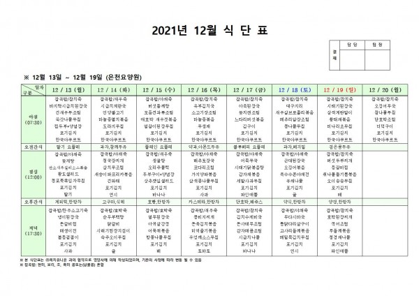 12월 셋째주 식단표 페이지 정보 작성자 은천노인복지회 작성일21-12-15 11:52 조회123,210회 댓글0건 관련링크 이전글 다음글 목록 답변 본문 . 이전글 다음글 목록 답변