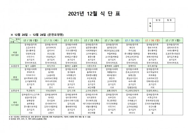 12월 넷째주 식단표 페이지 정보 작성자 은천노인복지회 작성일21-12-16 17:24 조회122,776회 댓글0건 관련링크 이전글 다음글 목록 답변 본문 . 이전글 다음글 목록 답변