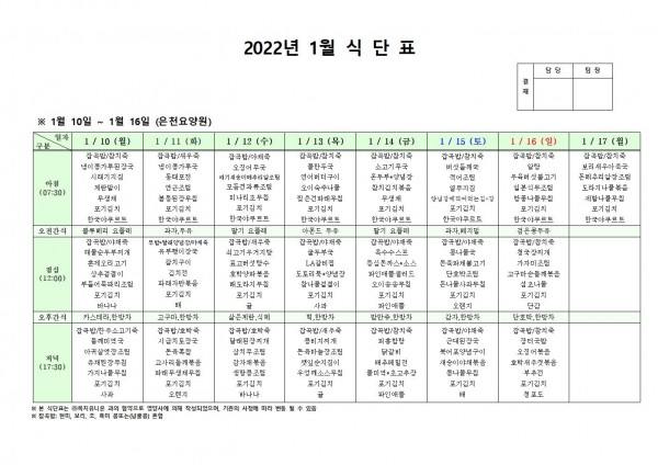1월 둘째주 식단표 페이지 정보 작성자 은천노인복지회 작성일22-01-07 10:03 조회121,881회 댓글0건 관련링크 이전글 다음글 목록 답변 본문 . 이전글 다음글 목록 답변