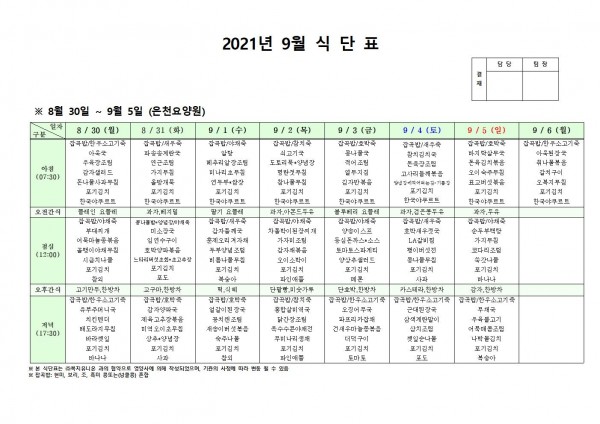 9월 첫째주 식단표 페이지 정보 작성자 은천노인복지회 작성일21-08-26 17:14 조회129,503회 댓글0건 관련링크 이전글 다음글 목록 답변 본문 . 이전글 다음글 목록 답변