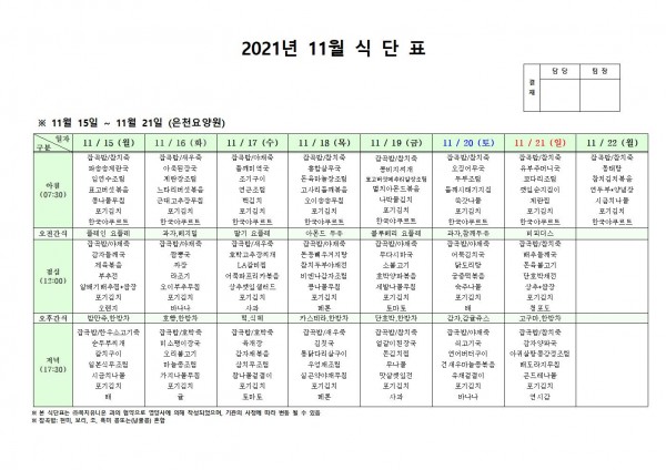 11월 셋째주 식단표 페이지 정보 작성자 은천노인복지회 작성일21-11-25 17:11 조회126,496회 댓글0건 관련링크 이전글 다음글 목록 답변 본문 . 이전글 다음글 목록 답변