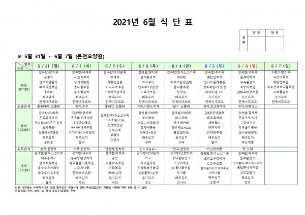 6월 첫째주 식단표 페이지 정보 작성자 은천노인복지회 작성일21-05-28 09:47 조회135,166회 댓글0건 관련링크 이전글 다음글 목록 답변 본문 . 이전글 다음글 목록 답변