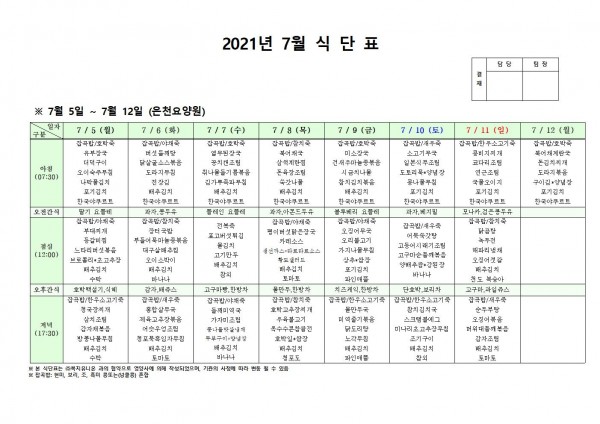 7월 첫째주 식단표 페이지 정보 작성자 은천노인복지회 작성일21-07-02 16:57 조회134,535회 댓글0건 관련링크 이전글 다음글 목록 답변 본문 . 이전글 다음글 목록 답변