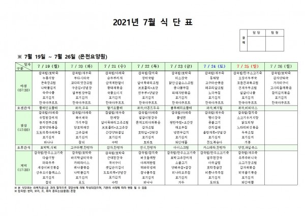 7월 셋째주 식단표 페이지 정보 작성자 은천노인복지회 작성일21-07-22 11:18 조회133,228회 댓글0건 관련링크 이전글 다음글 목록 답변 본문 . 이전글 다음글 목록 답변