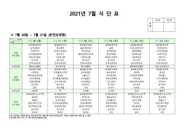 7월 넷째주 식단표 페이지 정보 작성자 은천노인복지회 작성일21-08-05 10:26 조회132,228회 댓글0건 관련링크 이전글 다음글 목록 답변 본문 . 이전글 다음글 목록 답변