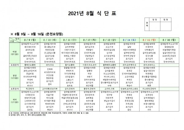 8월 둘째주 식단표 페이지 정보 작성자 은천노인복지회 작성일21-08-12 15:05 조회132,342회 댓글0건 관련링크 이전글 다음글 목록 답변 본문 . 이전글 다음글 목록 답변