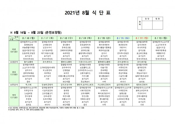 8월 셋째주 식단표 페이지 정보 작성자 은천노인복지회 작성일21-08-12 17:43 조회131,322회 댓글0건 관련링크 이전글 다음글 목록 답변 본문 . 이전글 다음글 목록 답변