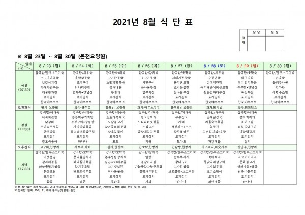 8월 넷째주 식단표 페이지 정보 작성자 은천노인복지회 작성일21-08-19 17:44 조회131,629회 댓글0건 관련링크 이전글 다음글 목록 답변 본문 . 이전글 다음글 목록 답변