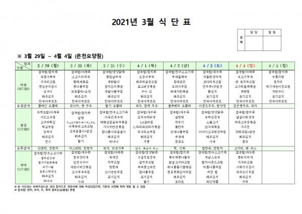 3월 다섯째주 식단표 페이지 정보 작성자 은천노인복지회 작성일21-03-25 17:09 조회141,397회 댓글0건 관련링크 이전글 다음글 목록 답변 본문 3월 다섯째주 식단표 이전글 다음글 목록 답변
