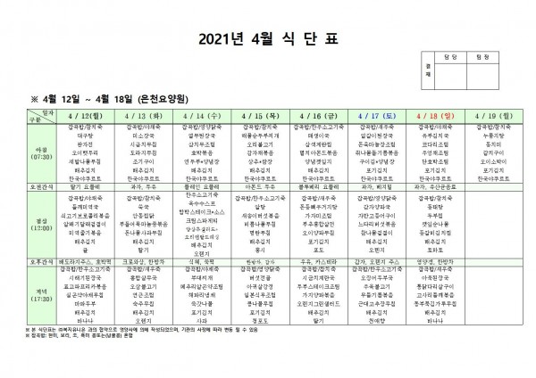 4월 둘째주 식단표 페이지 정보 작성자 은천노인복지회 작성일21-04-08 19:12 조회140,345회 댓글0건 관련링크 이전글 다음글 목록 답변 본문 4월 둘째주 식단표 이전글 다음글 목록 답변