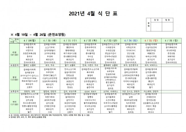 4월 셋째주 식단표 페이지 정보 작성자 은천노인복지회 작성일21-04-15 19:35 조회140,810회 댓글0건 관련링크 이전글 다음글 목록 답변 본문 4월 셋째주 식단표 이전글 다음글 목록 답변