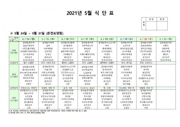 5월 넷째 주 식단표 페이지 정보 작성자 은천노인복지회 작성일21-05-21 16:38 조회136,229회 댓글0건 관련링크 이전글 다음글 목록 답변 본문 5월 넷째 주 식단표 이전글 다음글 목록 답변