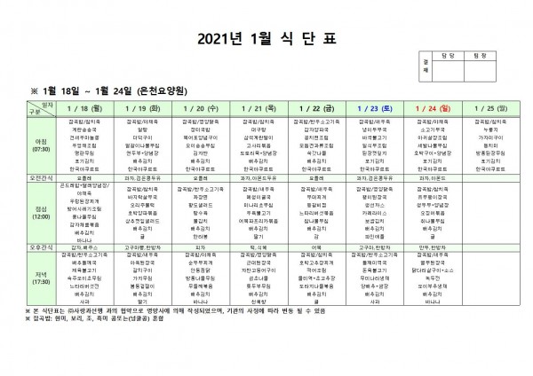 1월 셋째주 식단표 페이지 정보 작성자 은천노인복지회 작성일21-01-15 10:02 조회148,670회 댓글0건 관련링크 이전글 다음글 목록 답변 본문 . 이전글 다음글 목록 답변