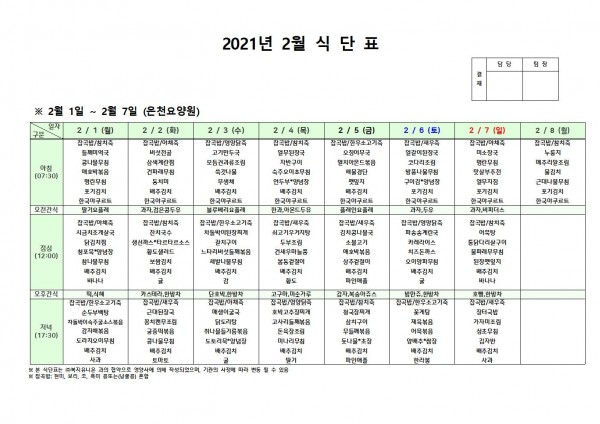 2월 첫째주 식단표 페이지 정보 작성자 은천노인복지회 작성일21-01-28 17:45 조회148,675회 댓글0건 관련링크 이전글 다음글 목록 답변 본문 . 이전글 다음글 목록 답변