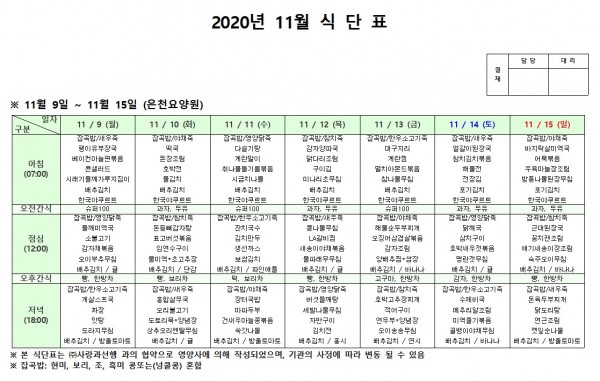 11월 둘째주 식단표 페이지 정보 작성자 은천노인복지회 작성일20-12-08 18:09 조회155,504회 댓글0건 관련링크 이전글 다음글 목록 답변 본문 11월 둘째주 식단표 이전글 다음글 목록 답변