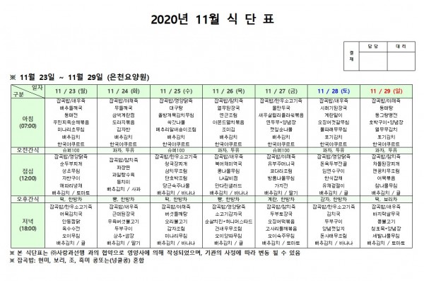 11월 넷째주 식단표 페이지 정보 작성자 은천노인복지회 작성일20-12-08 18:10 조회154,404회 댓글0건 관련링크 이전글 다음글 목록 답변 본문 . 이전글 다음글 목록 답변