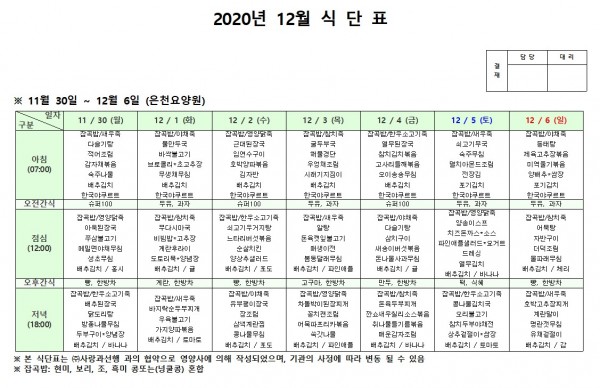 12월 첫째주 식단표 페이지 정보 작성자 은천노인복지회 작성일20-12-08 18:10 조회154,294회 댓글0건 관련링크 이전글 다음글 목록 답변 본문 . 이전글 다음글 목록 답변