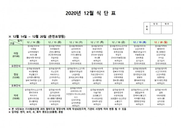 12월 셋째주 식단표 페이지 정보 작성자 은천노인복지회 작성일20-12-15 13:41 조회153,837회 댓글0건 관련링크 이전글 다음글 목록 답변 본문 . 이전글 다음글 목록 답변