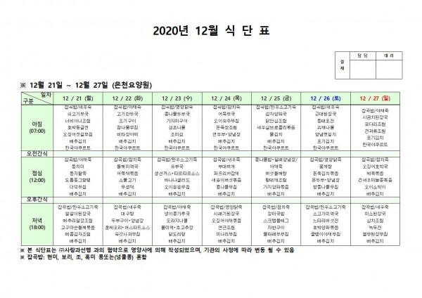 12월 넷째주 식단표 페이지 정보 작성자 은천노인복지회 작성일20-12-21 17:39 조회153,395회 댓글0건 관련링크 이전글 다음글 목록 답변 본문 . 이전글 다음글 목록 답변