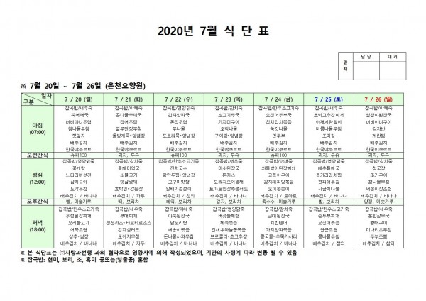 7월 넷째주 식단표 페이지 정보 작성자 은천노인복지회 작성일20-08-10 11:31 조회166,496회 댓글0건 관련링크 이전글 다음글 목록 답변 본문 . 이전글 다음글 목록 답변