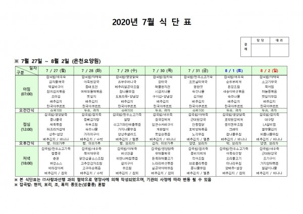 7월 다섯째주 식단표 페이지 정보 작성자 은천노인복지회 작성일20-08-10 11:32 조회165,718회 댓글0건 관련링크 이전글 다음글 목록 답변 본문 . 이전글 다음글 목록 답변