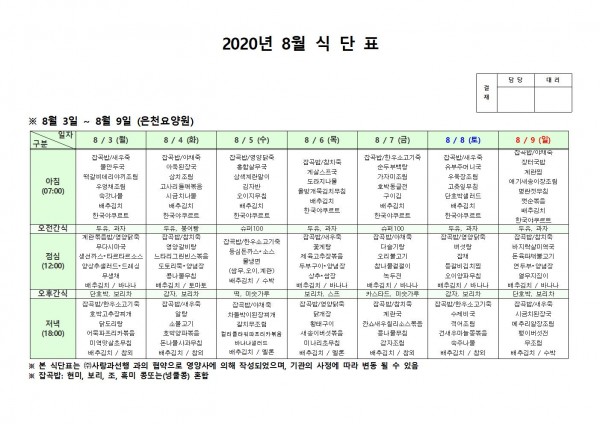 8월 첫째주 식단표 페이지 정보 작성자 은천노인복지회 작성일20-08-10 11:33 조회164,884회 댓글0건 관련링크 이전글 다음글 목록 답변 본문 , 이전글 다음글 목록 답변