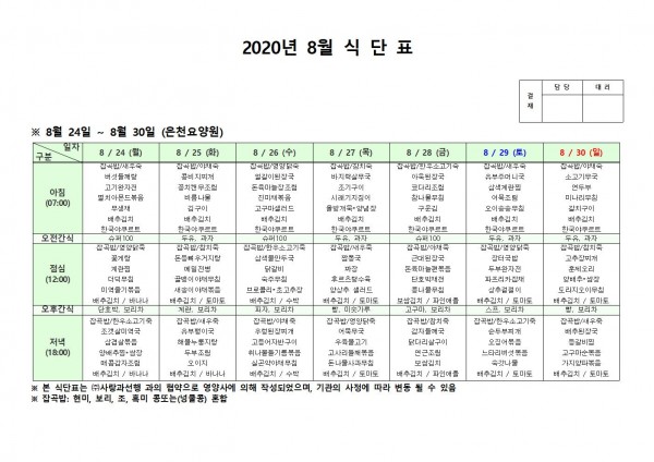 8월 넷째주 식단표 페이지 정보 작성자 은천노인복지회 작성일20-08-31 16:50 조회162,957회 댓글0건 관련링크 이전글 다음글 목록 답변 본문 . 이전글 다음글 목록 답변