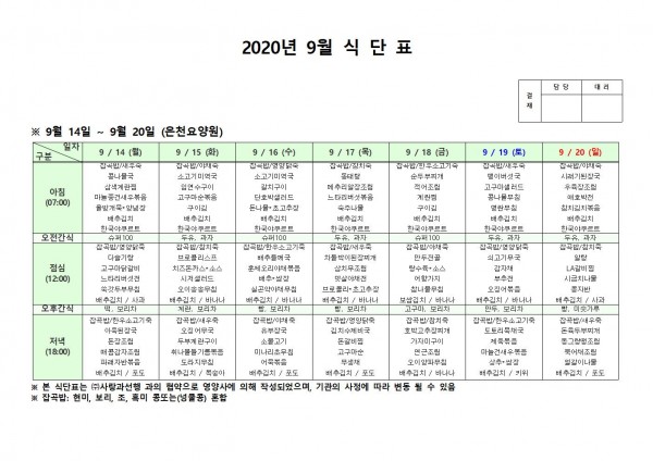 9월 셋째주 식단표 페이지 정보 작성자 은천노인복지회 작성일20-09-22 13:11 조회162,124회 댓글0건 관련링크 이전글 다음글 목록 답변 본문 . 이전글 다음글 목록 답변