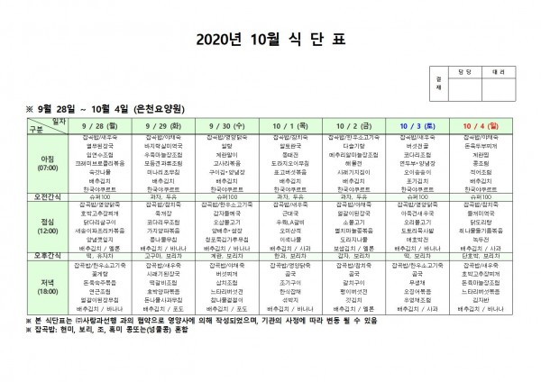 10월 첫째주 식단표 페이지 정보 작성자 은천노인복지회 작성일20-10-12 14:45 조회160,478회 댓글0건 관련링크 이전글 다음글 목록 답변 본문 . 이전글 다음글 목록 답변
